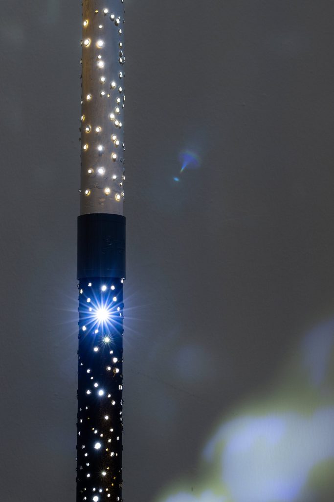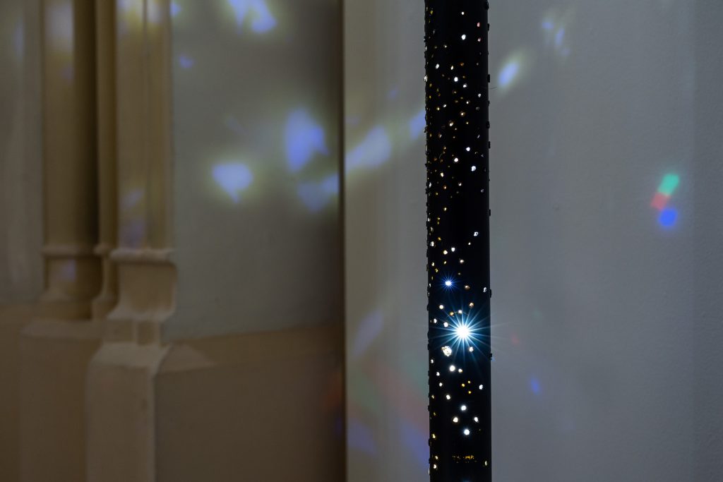 It is presented as an exhibition in the chapel of the Convalecencia Building in Murcia, composed of a sphere in the center of the room, two vertical pillars, and a set of stones, which are interpreted as a celestial dimension in contrast to the earthly one. The artwork focuses on the idea of an eternal energy that runs through the universe, showing the oscillations of a nucleus full of life.